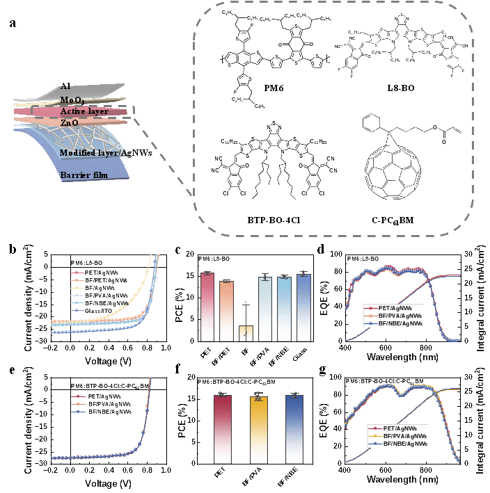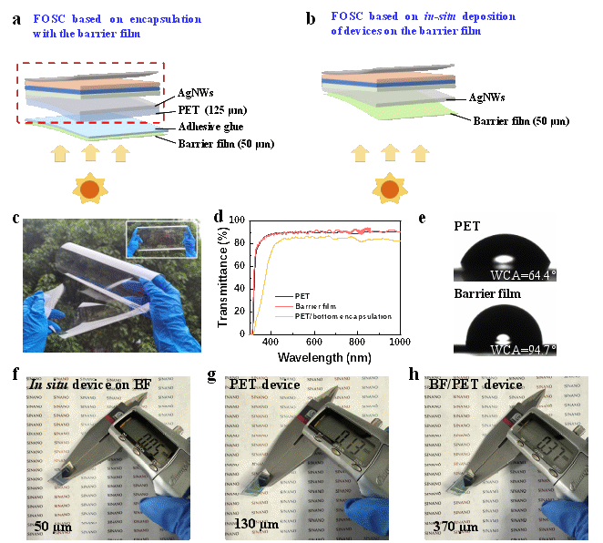 柔性有機太陽能電池(FOSCs)因其高效率、輕柔、可卷對卷印刷等特性,在光伏建筑一體化、可穿戴電子和便攜式能源等領域具有巨大的應用潛能。柔性透明導電電極是影響器件效率與穩(wěn)定性的關鍵,常規(guī)柔性襯底的水氧滲透導致器件性能衰減,嚴重制約其應用進程,而傳統(tǒng)的外層封裝結(jié)構(gòu)往往犧牲器件的光學與力學性能,同時會增加器件整體的重量。