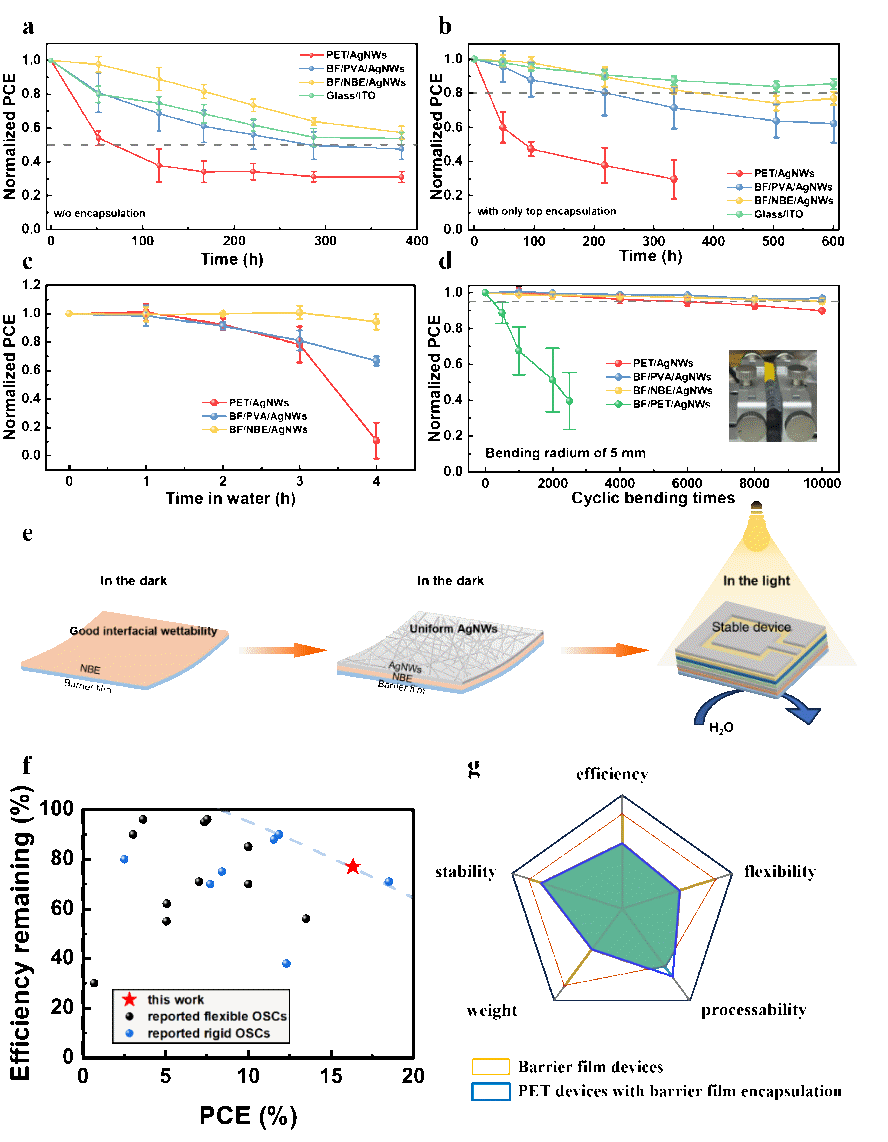 最后,在NBE修飾的阻隔膜上原位制備PM6:L8-BO二元體系和PM6:BTP-BP-4Cl:PC61BM三元體系的FOSCs器件,器件效率分別達到15.28%和16.33%。同時BF/NBE/AgNWs器件在空氣中放置600h后仍保留近80%的初始效率,在水中浸泡4h后仍保留平均高達94%的初始效率,且在彎折10000次后仍有95%的初始效率。這說明了親疏水NBE修飾策略可獲得兼具高效率與高穩(wěn)定性的柔性有機太陽能電池,為解決柔性有機太陽能電池穩(wěn)定性難題提供了新思路。